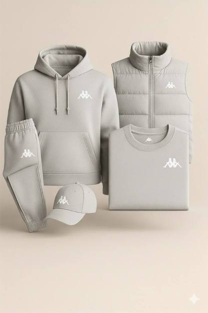Discover the perfect balance of comfort, design, and sporty elegance with this complete Kappa tracksuit Set. Comprising a hoodie, quilted vest, joggers, a t-shirt, and a matching cap, this kit embodies a modern and refined look, ideal for all seasons.