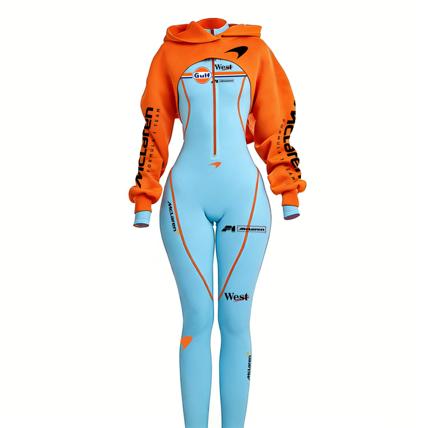 Retro Racing-Inspired Hooded Bodysuit with Bold Color Block Design